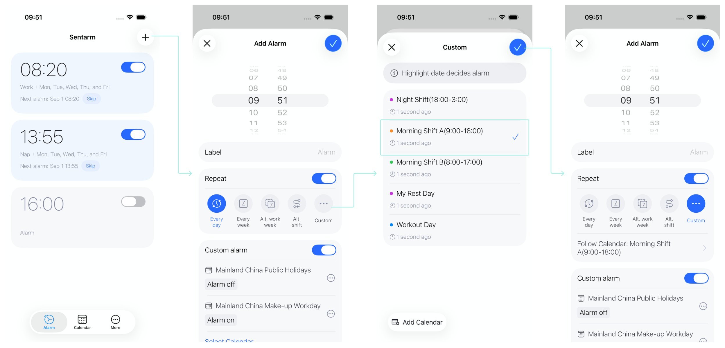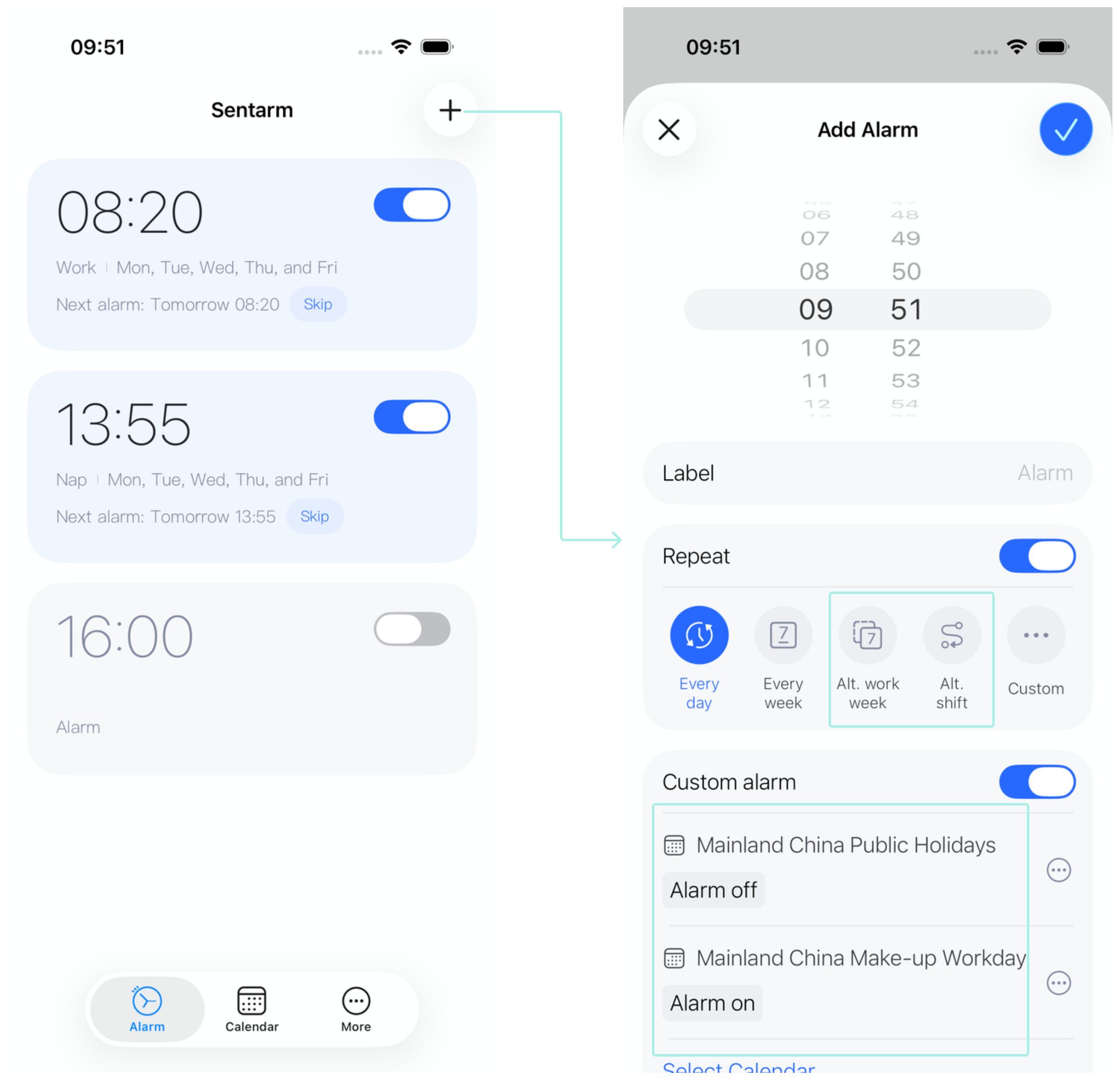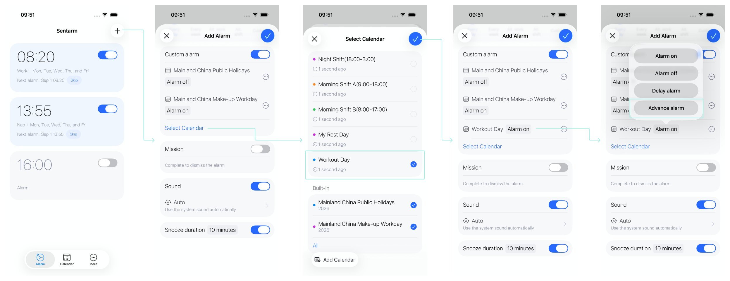 - Add an alarm, set the repeat option, then assign the custom calendar created in the previous step as its special alarm logic, with an early-ring setting