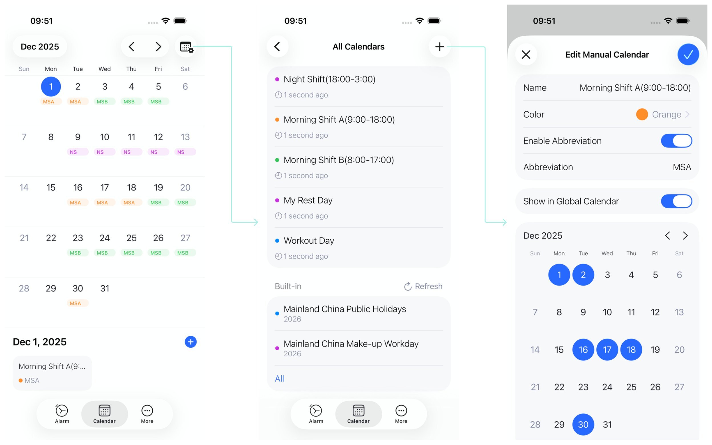 If your shifts can’t be covered by weekly cycles, alternating weeks, or rotations, you can create a custom calendar so alarms repeat according to its dates.