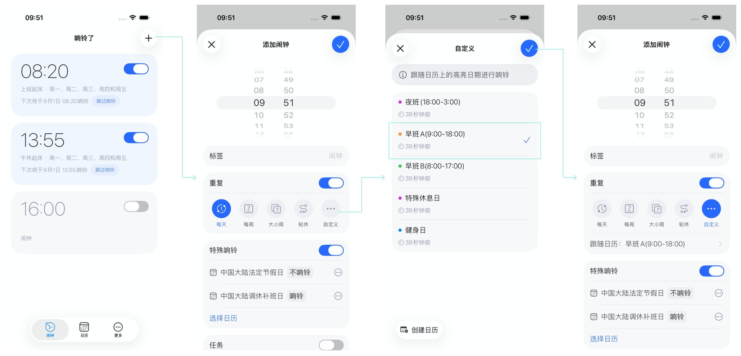 如果排班无法用每周循环、大小周或轮休来覆盖,那么就可以创建一个自己的日历,让闹钟根据这个日历的日期重复响铃。