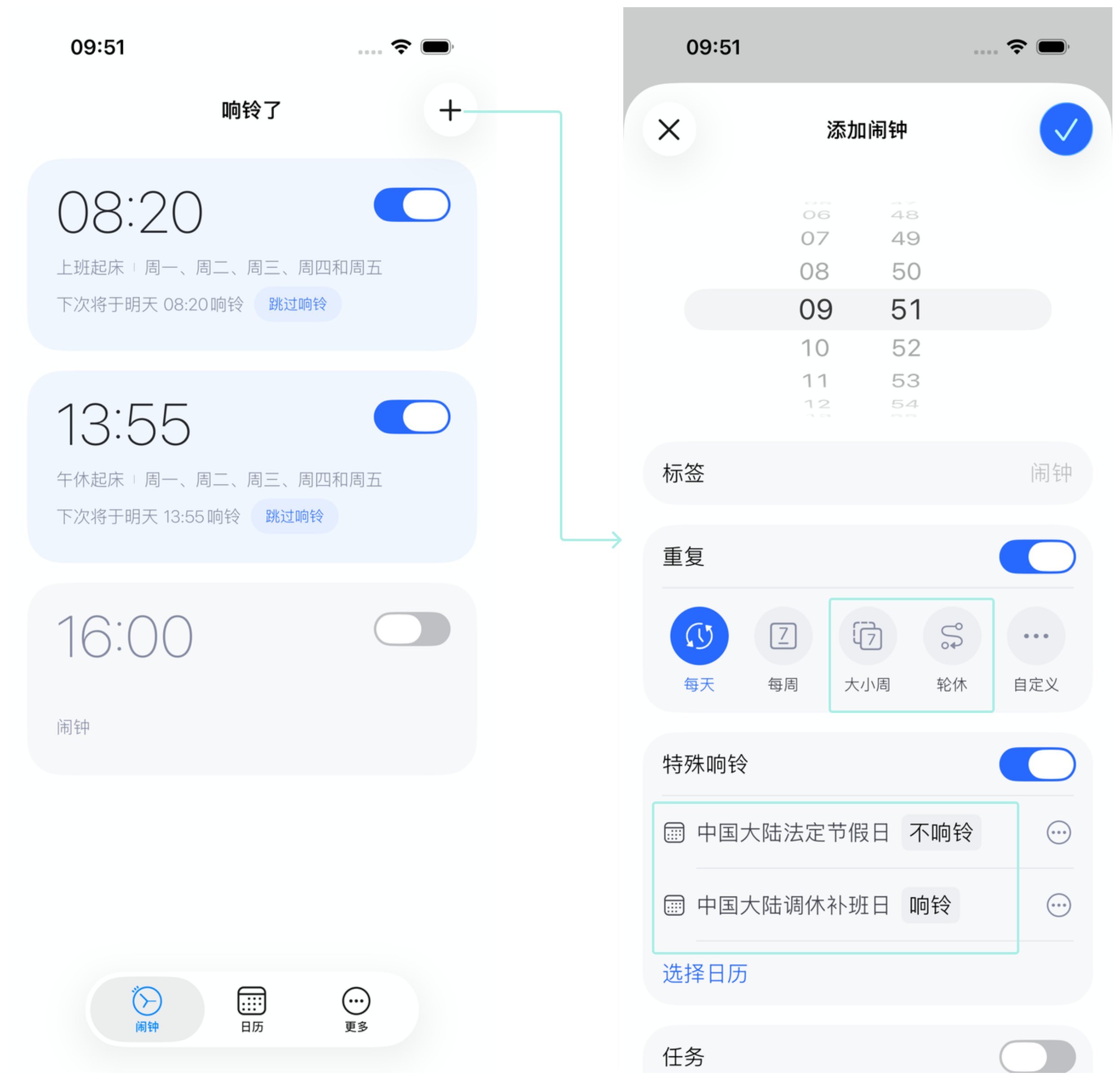 大小周、轮休、自由排班?再复杂的作息,响铃了都能简单搞定闹钟设置。