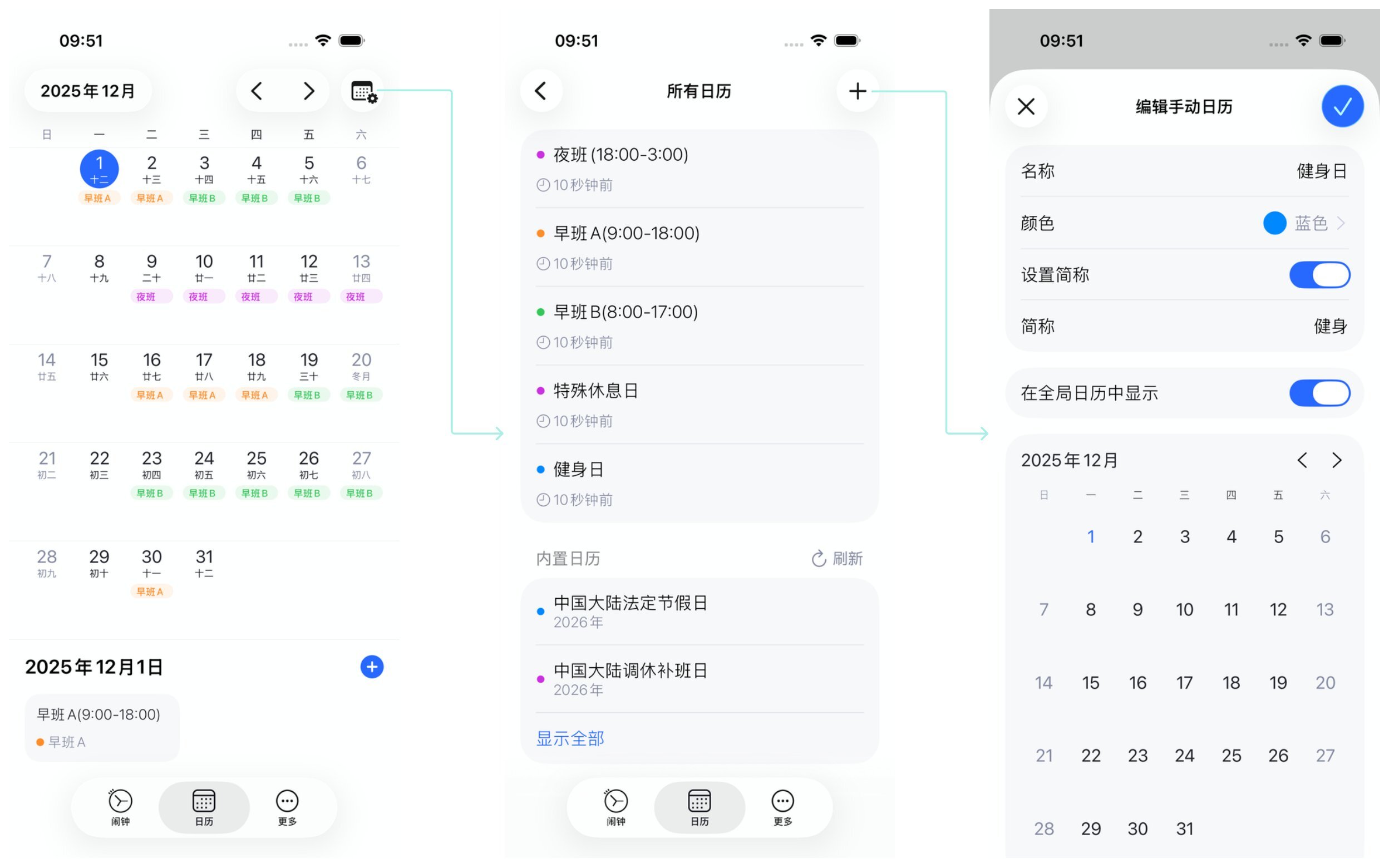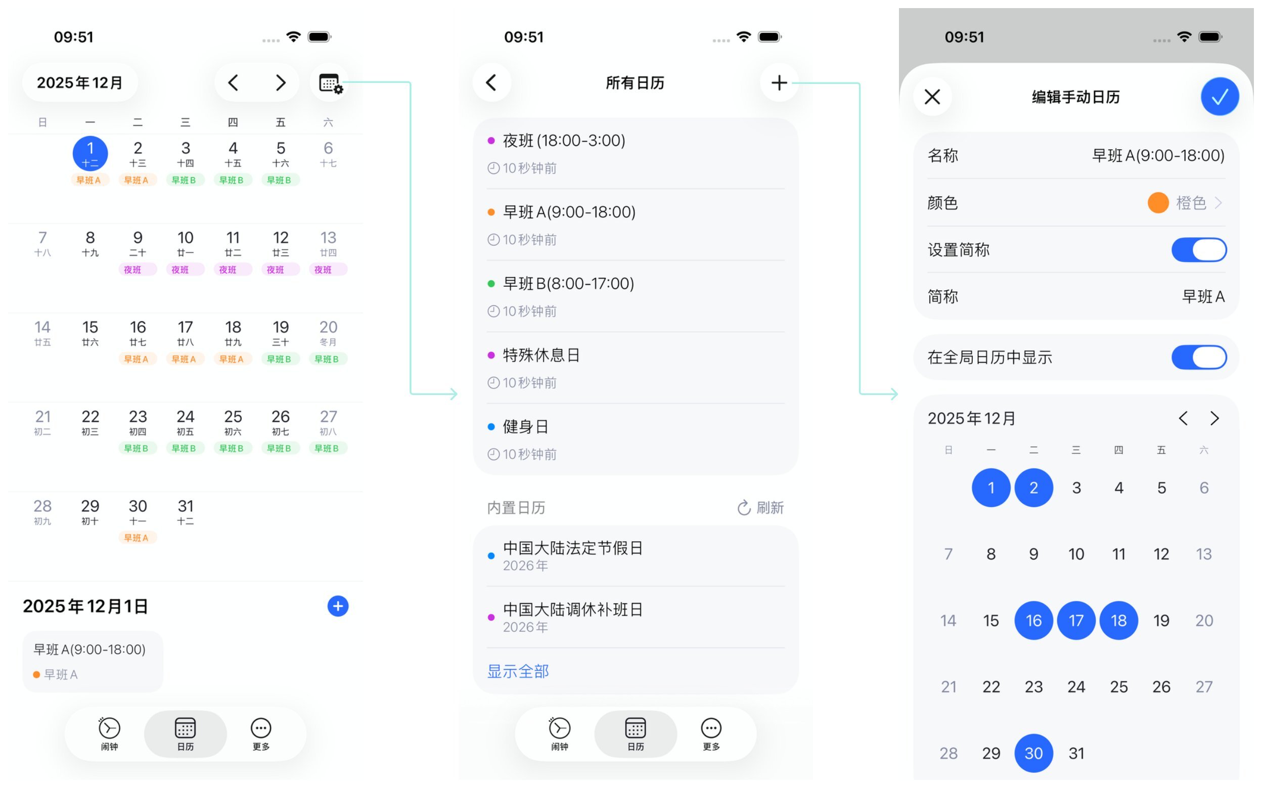 如果内置日历不够满足你的需求,或者你的排班机制需要更加灵活,你还可以用自定义日历功能,创建自己的日历!