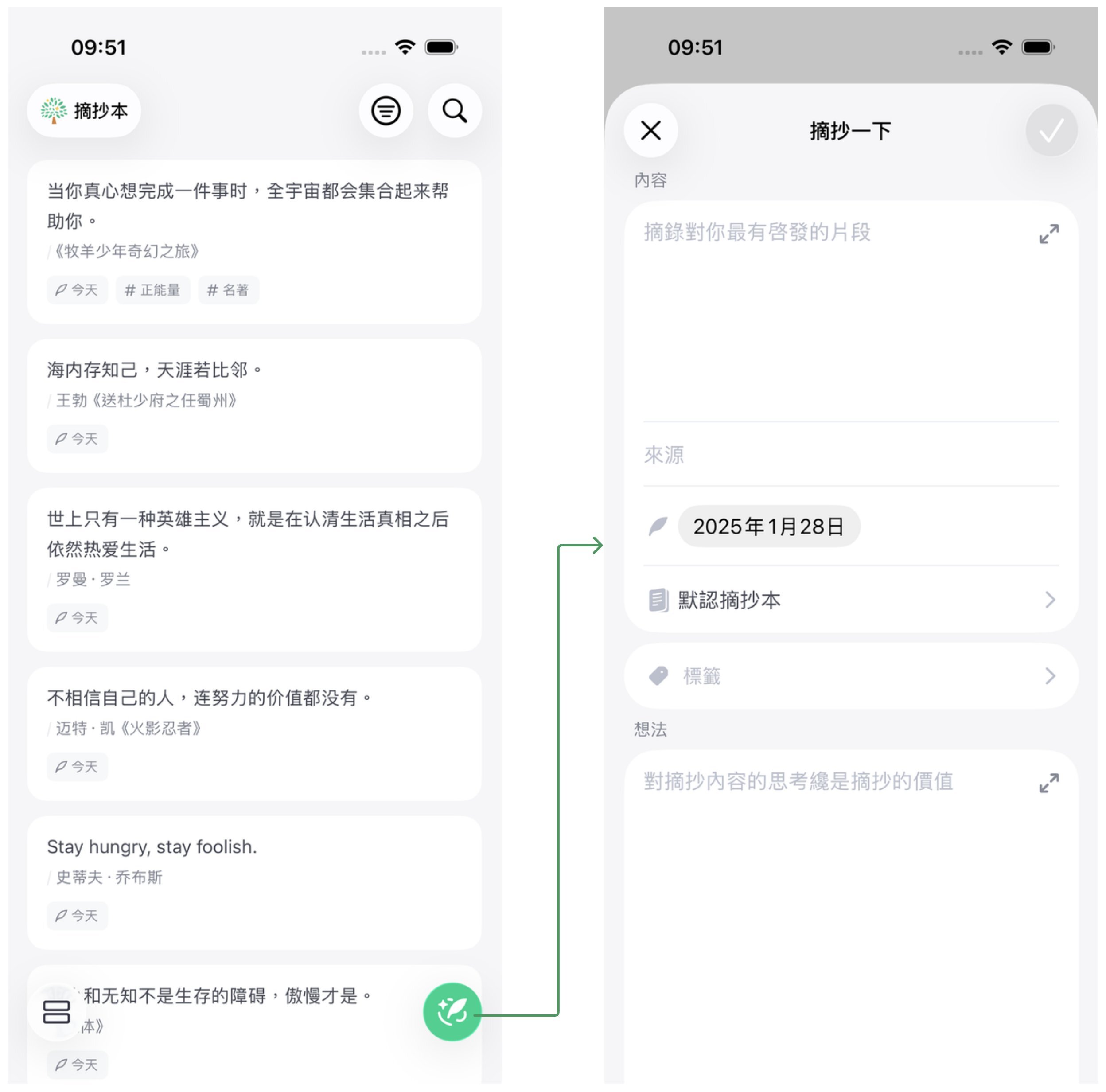 摘抄本是一款簡單好用的摘抄工具,你可以隨時隨地記錄那些打動你的好詞好句,並且能夠進一步寫下你的獨特思考,在日後隨時回顧。